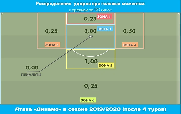 В основном острота создавалась в позиционных розыгрышах (11 из 21 голевых ситуаций), но неплохо работают и другие инструменты: против «Урала» Панченко с Шейдаевым организовали пару убойных моментов в контратаках (причем реализовали куда менее очевидный), со «Спартаком» бело-голубые дважды едва не наказали соперника при выходе из-под прессинга. В отличие от «Краснодара», команда Хохлова достаточно опасна при навесных стандартах – реальные шансы на гол у динамовцев возникали в каждом из четырех поединков.