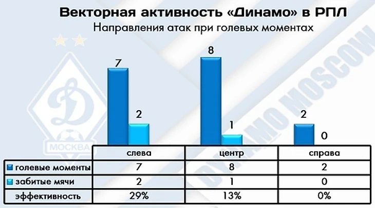 В прошлом сезоне у «Динамо» была самая качественная атака из всех андердогов, но по реализации бело-голубые оказались с отрывом худшими в лиге (лишь 25%). При этом если конвертация «неявных» моментов в голы чуть ниже среднего по лиге (19% против 22%), то «явные» динамовцы пороли со знанием дела (36% против средней планки в 45%).