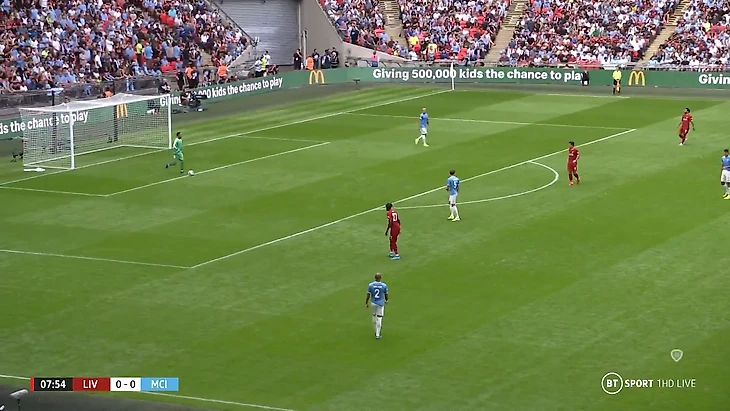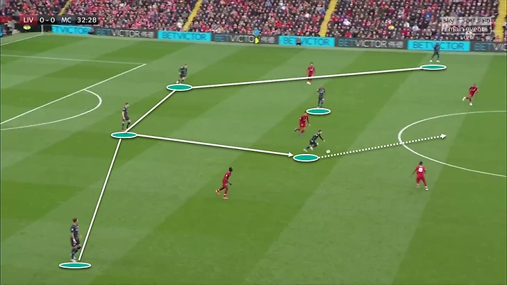 Теперь посмотрим как команда вводит мяч при новых правилах. Так как Стоунз находится в опорной зоне, Фирмино становится тяжелее прессинговать, потому что надо следить сразу за двумя игроками. Центральные полузащитники не могут выдвигаться выше, так как у них уже есть свой персональный соперник. Если Сити сможет быстро перемещать мяч в первой линии, то потенциально они могут выходить из под прессинга Ливерпуля, оставляя первую линию сзади. Раньше тоже также получалось выходить (когда смещался атакующий полузащитник: 6 игроков на своей половине поля против 5 игроков с новыми правилами), но тогда в атаке не хватало игроков и не было той структуры, которая позволяла бы эффективно и быстро двигать мяч и за это время Ливерпуль успевал возвращаться назад.