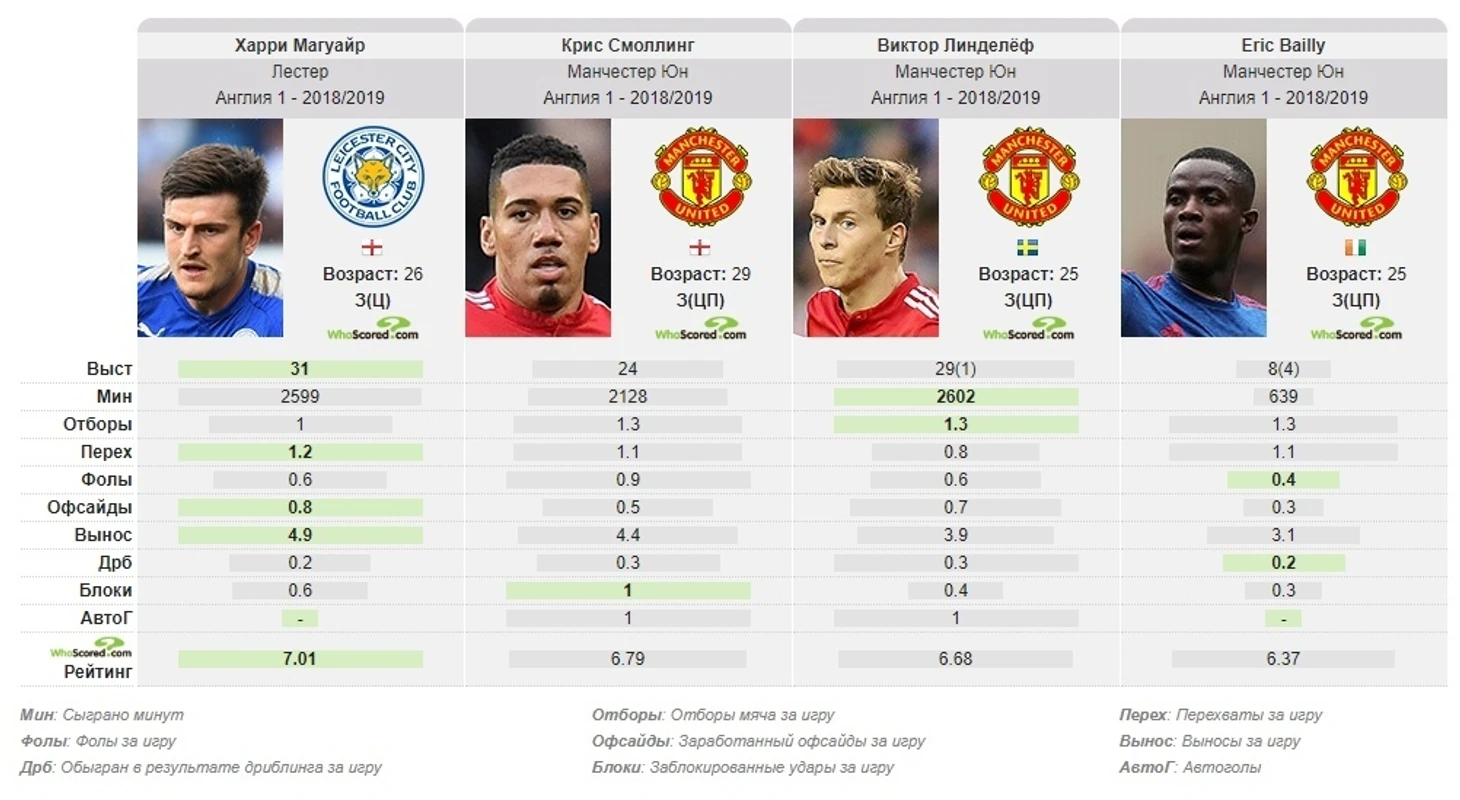 • Харри предпочитает грамотно выбирать позицию и чисто отбирать мяч, а не прыгать в рискованных подкатах. В прошлом сезоне он совершил 83,78% успешных отборов. В целом в сезоне-2018/19 Магуайр совершал 7,86 удачных оборонительных действий (отборов и перехватов).