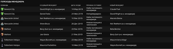 Его место занял свободный Массимилиано Алегри. Также своих менеджеров сменили Уотфорд(вместо Хави Грасии пришел другой испанский специалист Рафа Бенитез), Ньюкасл(сняли Стива Брюса и назначили великого Марсело Бьелсу) и Норвич(был уволен Дэниэль Фарк и назначен на его место Клод Пюэль).