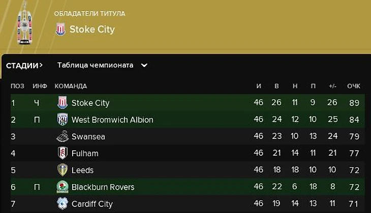Из Чемпионшипа в элиту английского футбола вернулись Сток Сити, Вест Бром и легендарный Блэкберн Роверс.
