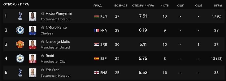 Игроки, которые чаще всего отбирали мяч за игру. У Ваньямы хорошие показатели, одна всего 17 игр в старте (6 выходов на замену), а маленький пылесос Н’Голо Кантэ стал одним из лучших в лиге, сыграв в каждом матче.