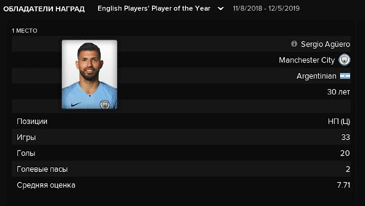 Игроком года стал Кун Агуэро, который за 33 игры забил 20 голов и сделал 2 голевые передачи, тем самым помог Сити стать чемпионами 3 года подряд.