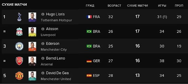 Золотую перчатку выиграл Уго Льорис, сыграв 17 матчей на 0. Удивительно, что Тоттенхэм закончил лишь на 5 месте с такими показателями у француза. Алиссон также набрал 17 клиншитов, но сыграл на 2 игры больше.