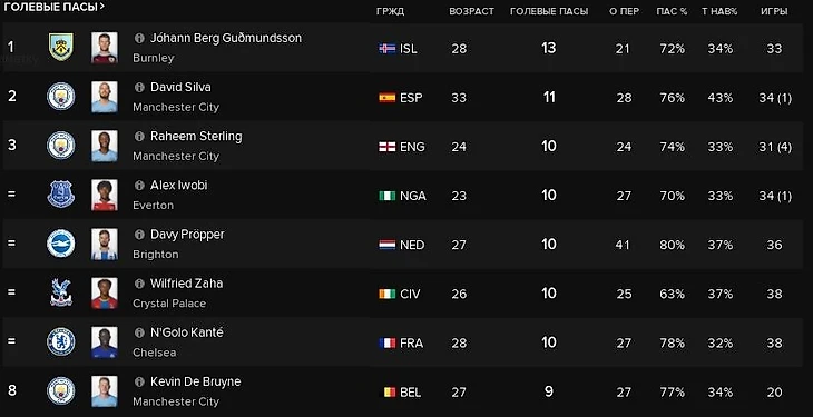 Теперь вернемся к АПЛ и посмотрим, кто из игроков проявил себя лучше всех.