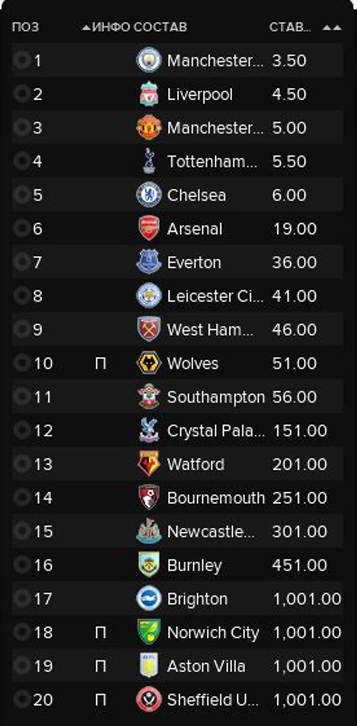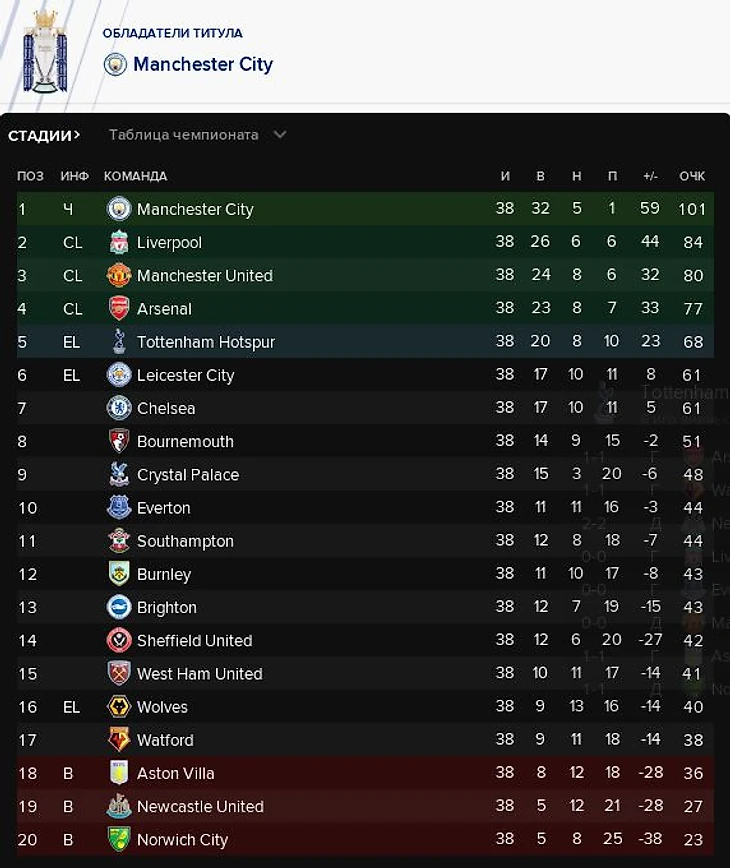 Манчестер Сити, как и прогнозировалось, стали безоговорочными чемпионами, набрав 101 очко и проиграв лишь 1 встречу. Как мы видим топ-3 совпало полностью, а дальше пошли изменения. Арсенал залез в Лигу Чемпионов, а Челси остался мимо еврокубковкой зоны, уступив по разнице мячей Лестеру. Астон Вилла и Норвич Норридж не смогли закрепиться в Премьер-Лиги после промоушена – Ньюкасл составит им компанию в Чемпионшипе.