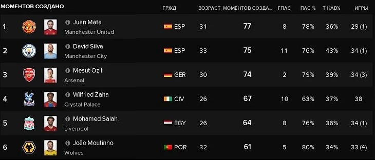 Так же таблица с игроками, которые создали больше всего моментов для своих партнеров. Как мы видим Хуану Мате в этом году доверяли намного больше игрового времени. Он стал одним из лучших плеймейкеров лиги, однако партнеры упустили много моментов – всего 8 голевых передач.