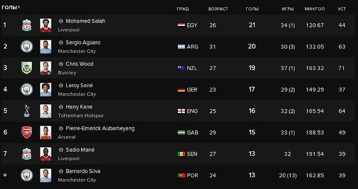 В целом картина довольно предсказуемая, за исключением КРИСА ВУДА. Удивительным образом новозеландец настрелял 19 мячей в чемпионате, но Бернли закончили лишь на 12-й строчке. Также удивляет, что нет представителей Манчестер Юнайтед, хотя команда заняла 3 место в чемпионате.