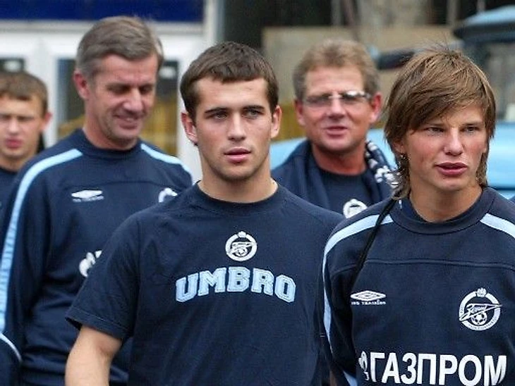 На фото: Молодежь, подающая надежды. Александр Кержаков и Андрей Аршавин на фоне своих наставников Властимила Петржелы (справа) и Владимира Боровички (слева, ассистент главного тренера), 2003 год.