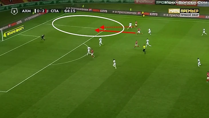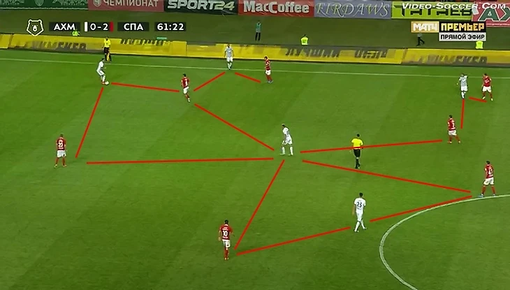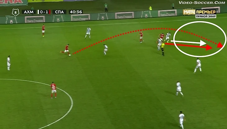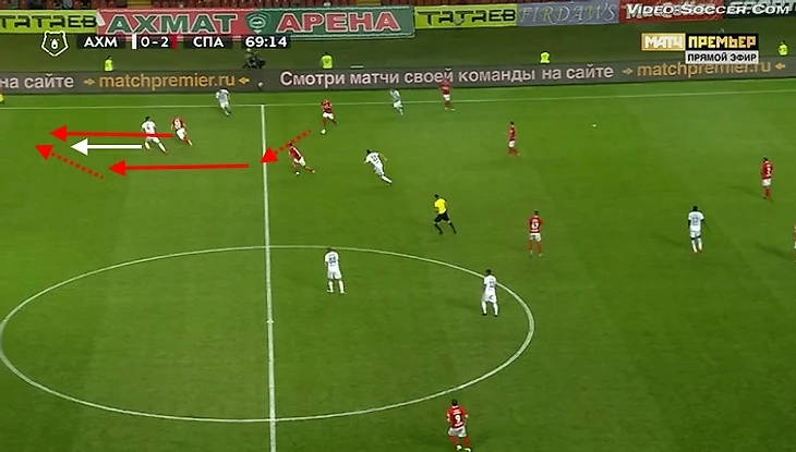Ранее я писал о том, что с таким подбором футболистов атаки говорить о какой-то высокой организации игры впереди может быть странно. Последние две встречи мы наблюдали хаотический характер взаимодействия между игроками. Проникающие и острые передачи часто не сопровождались подключениями в свободные зоны и наоборот. В гостевой встрече против «Ахмата» индивидуальные качества отдельных футболистов слились в эффектную и эффективную синхронность. Это подтверждается и цифрами по передачам с продвижением мяча вперед, передачам в финальную треть и ключевым передачам в сравнении с матчем против «Туна» в Швейцарии (72 (69.44%), 49 (73.47%), 11 (36.36%) против 61 (57.38%), 46 (45.65%), 3 (66.7%)). А в последние месяцы именно подвижности и остроты впереди как раз не хватало красно-белым для успешного завершения атак.