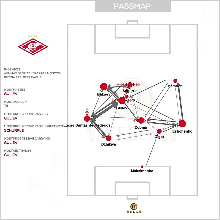По какой схеме выступал «Спартак» в Грозном — отдельная головоломка. Тепловые карты и усредненные позиции футболистов говорят о том, что речь идет о 4-3-3. Сумбур в данном вопросе вызывает манера игры Тиля. Голландец очень вольготно перемещался в середине поля. И выполненный им объем работы превышает необходимые требования как для позиции под нападающим, так и для box-to-box — он создавал численное равенство или преимущество в центре как в атаке, так и обороне при прессинге.