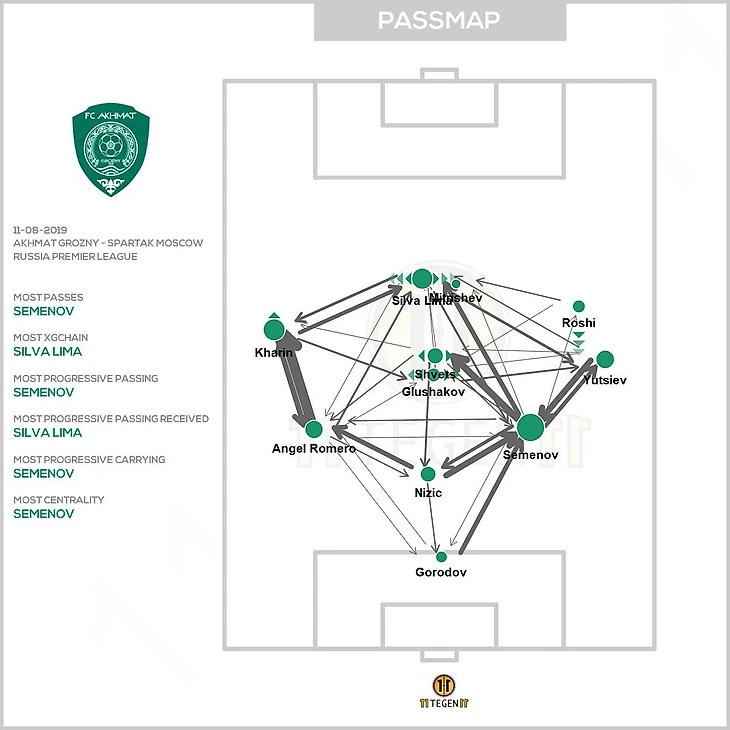 Также карта передач подтверждает визуальные впечатления о розыгрыше мяча в треугольниках на флангах. На правом краю наблюдалась связка Ещенко-Зобнин-Ларссон. На левом: Айртон-Гулиев-Бакаев. Подобные связки можно назвать задатками игры в комбинационный футбол и позиционную атаку.