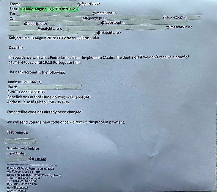 Сотрудник клуба написал: «В соответствии с тем, что Педру только что сказал Максиму по телефону, сделка отменяется, если мы не получим подтверждение платежа сегодня до 19:15 по португальскому времени (21:15 по московскому, за 45 минут до начала матча).