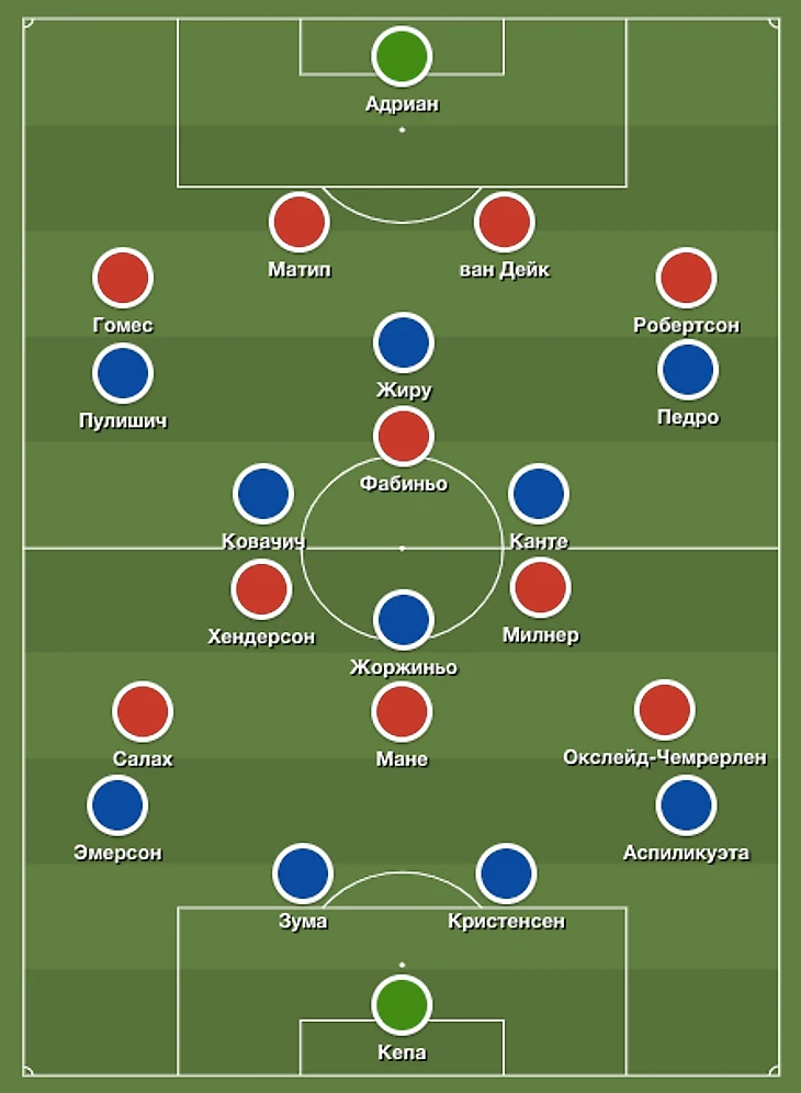 «Челси» понадобилось десять минут, чтобы привыкнуть и к такой игре. После 60 «синие» начали прессинговать, а Милнер перестал успевать за Канте. Клопп заменил англичанина на Вейналдума. Теперь у «Ливерпуля» привычное сочетание в полузащите Хендерсон-Фабиньо-Вейналдум. Лэмпард реагирует и добавляет свежести в атаку: ушли Жиру и Пулишич, а вышли Тэмми Абрахам и Мэйсон Маунт. Ближе к концу основного времени «Челси» правильно и вовремя прессинговал: