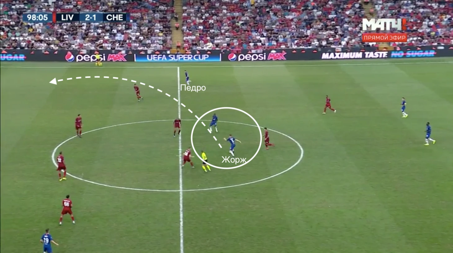 Педро видит движение Канте. Француз использует пространство на фланге и получит пас. Нголо сделает прострел в штрафную, а ван Дейк за ним не успеет. Ситуация тесно пересекается с забеганиями Хендерсона.