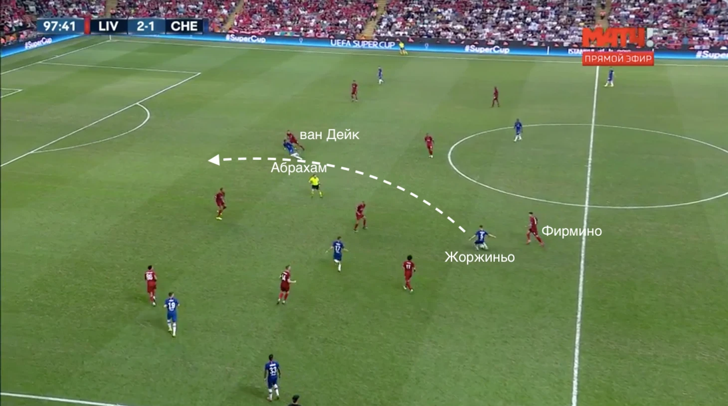 Фирмино не придает значение свободе Жоржиньо. Опорник «Челси» сделает пас за спину, который позволит выиграть забег Абрахаму у ван Дейка.