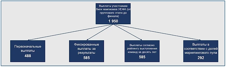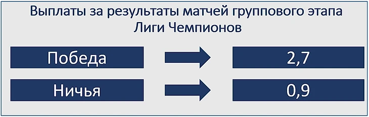 Эта сумма выплачивается за результаты матчей в группе, а также за выход в 1/8 финала ЛЧ и дальнейшее продвижение по сетке турнира. Бонус за каждую победу на групповом этапе составит 2,7 млн, за ничью - 0,9 млн. Неиспользованные средства (0,9 млн с каждой ничьей) суммируются и перераспределяются среди участников группового этапа в пропорциональной зависимости от количества побед.