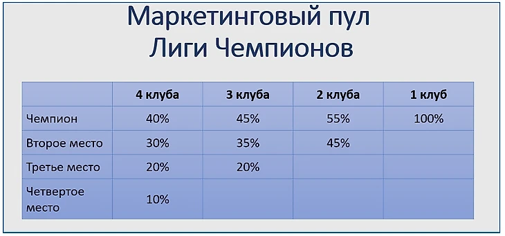 Победители Лиги чемпионов или Лиги Европы, которые прошли в Лигу чемпионов не через национальное первенство, из этой половины маркетингового пула не получают ничего.