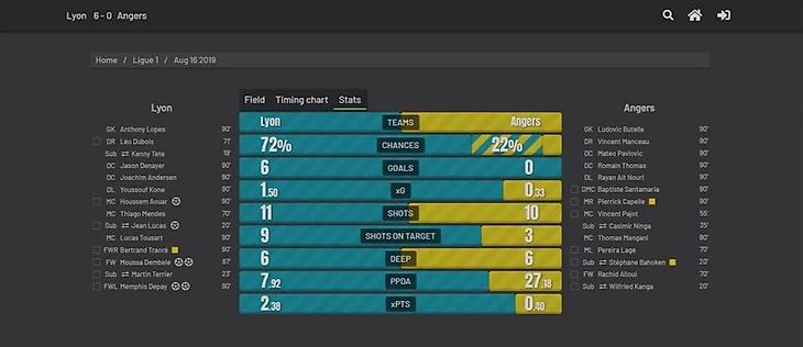 Итого по Xg 1.5-0.22 (на скриншоте засчитан удар Канга, несмотря что там был оффсайд). Поздравим всех фанатов Лиона с сумасшедшей реализацией, не иначе.