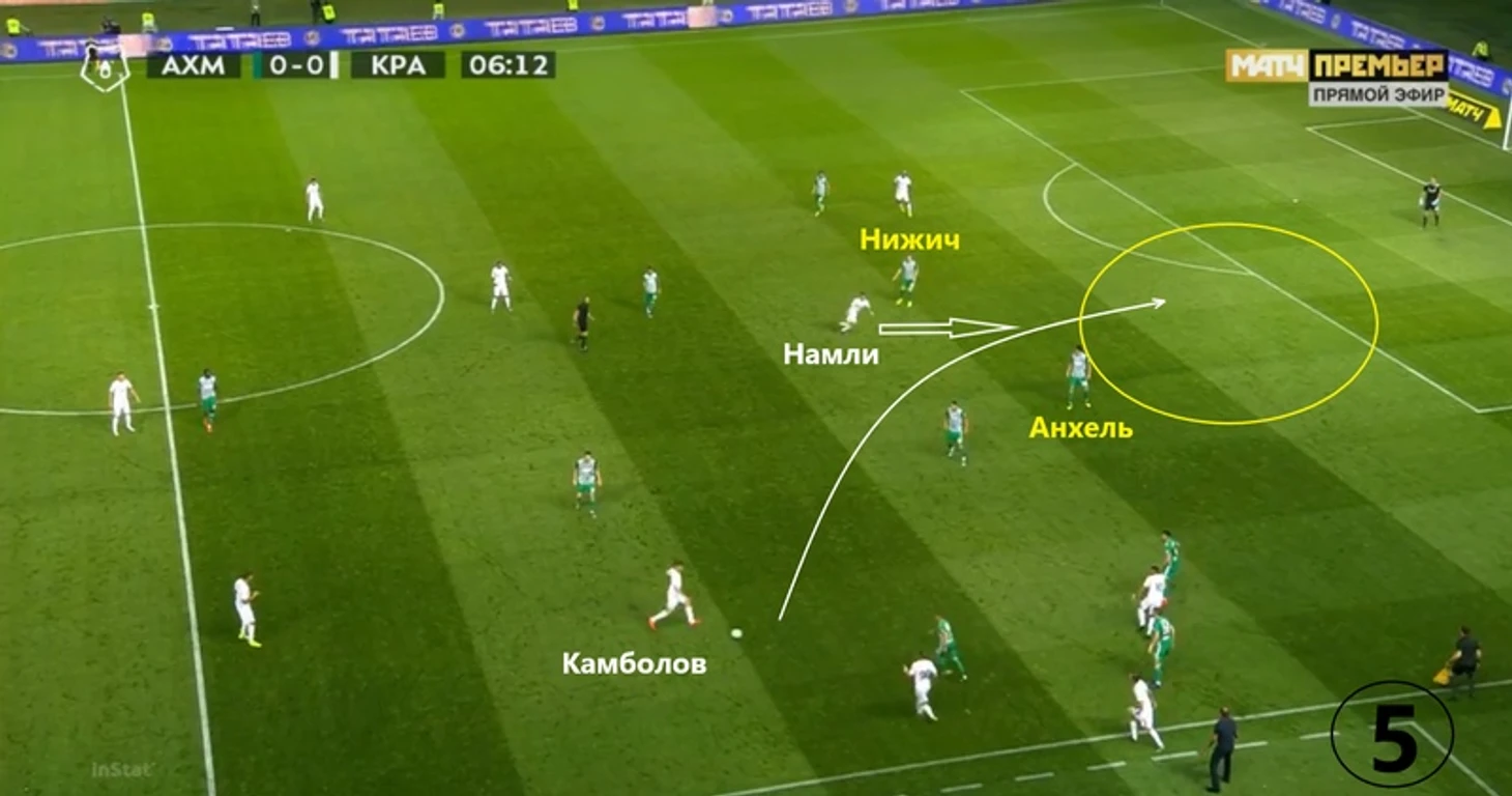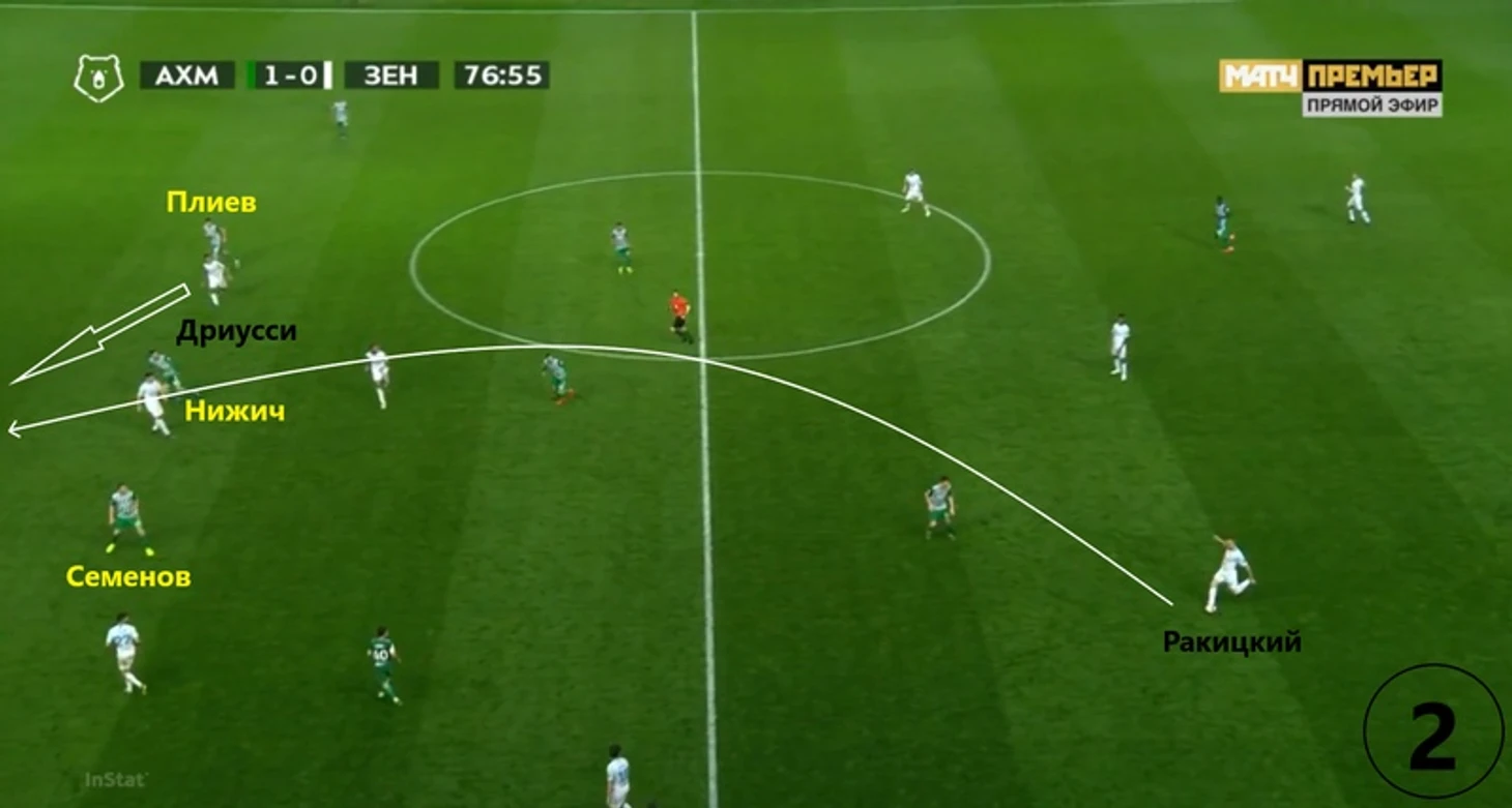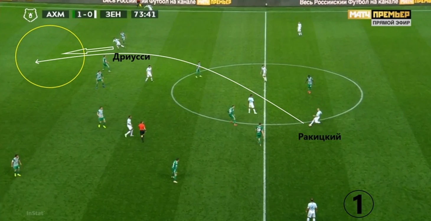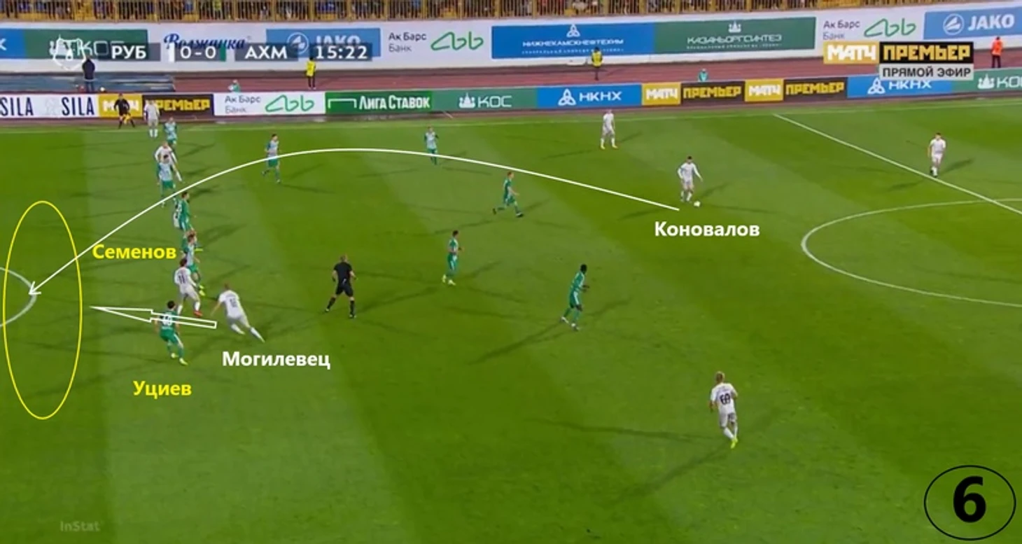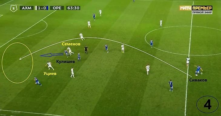При этом стоит отметить, что габаритный центр обороны «Ахмата» обеспечивает команде высокий уровень устойчивости к кроссам. В предыдущих матчах у ворот Городова возникла только одна острая ситуация после навеса с фланга (не со стандарта), которая привела к голу Деспотовича сумасшедшим ударом через себя (на стоп-кадре номер 4 показана ее начальная фаза), но это исключение как раз из тех, что только подтверждают общее правило.