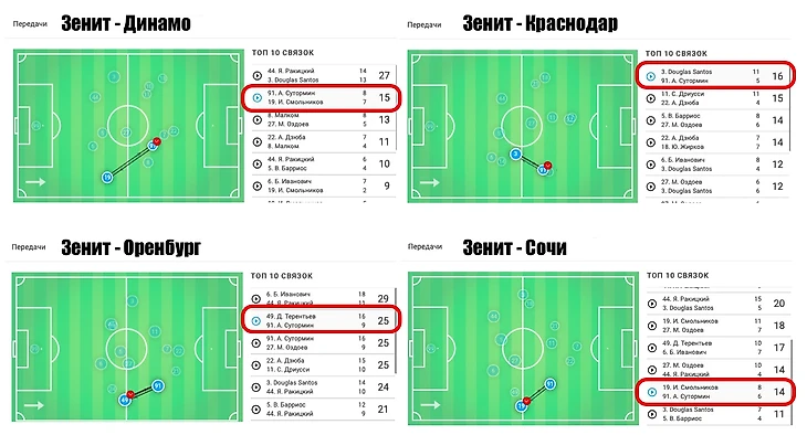 В четырех матчах из 5 в топ-10 связок по передачам входит Сутормин вместе с крайним правым защитником. Это важный момент, частично обнажающий проблему.