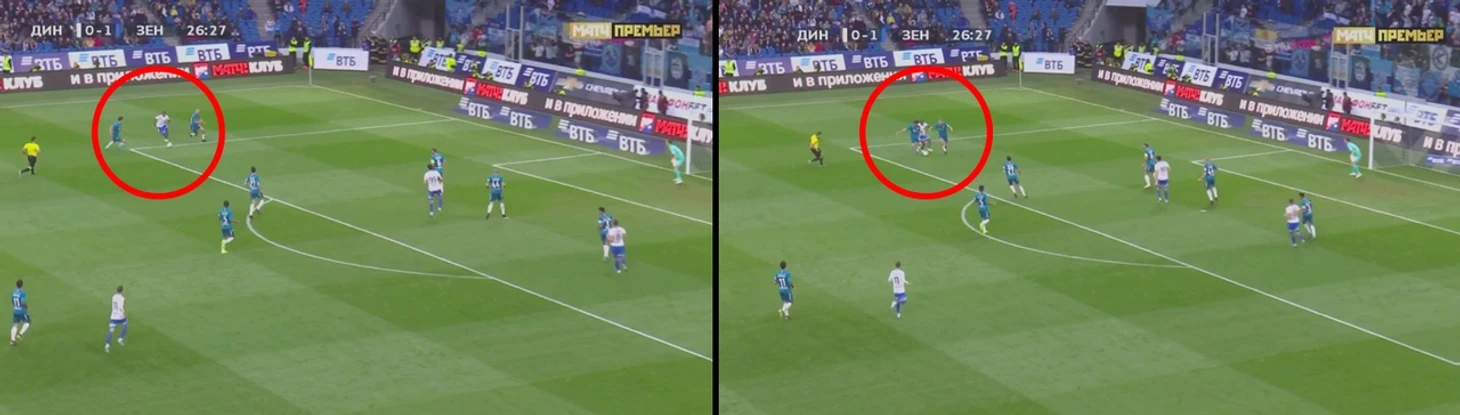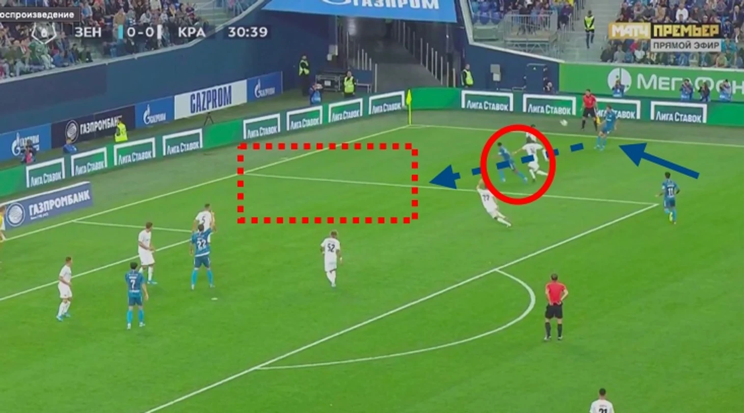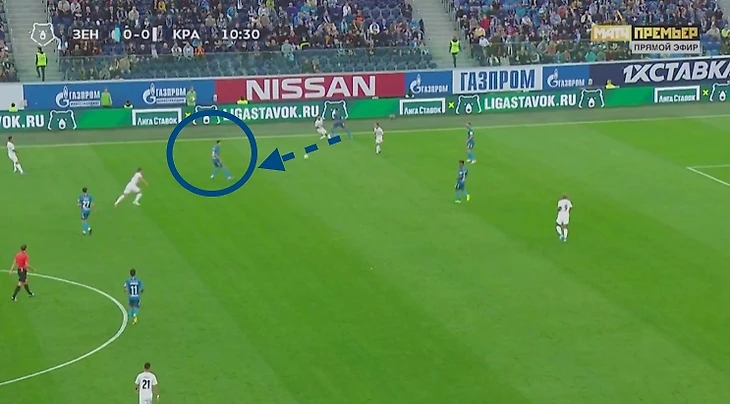 Получая мяч в начале финальной трети спиной к воротам, под давлением, полузащитник Зенита не может обыграть оппонента. Он становится своеобразным якорем , через который команда может отыграть мяч, например, для вытягивания защитников, но не более.