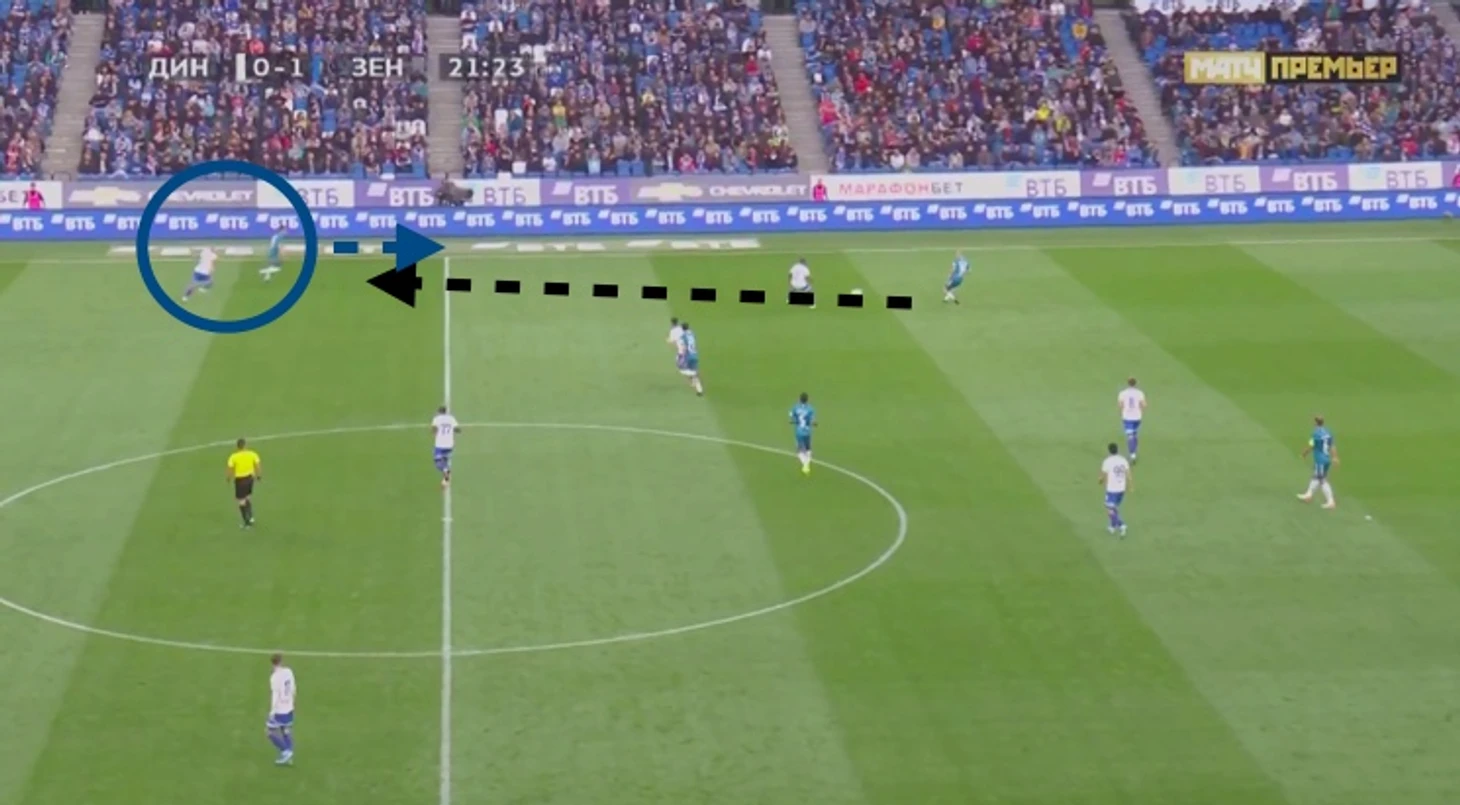 Передача от крайнего защитника крайнему полузащитнику в позиционной атаке, как правильно, несмотря на то, что технически это продвижение мяча, фактически таковым не является, что отлично видно на примере последнего матча с Динамо.