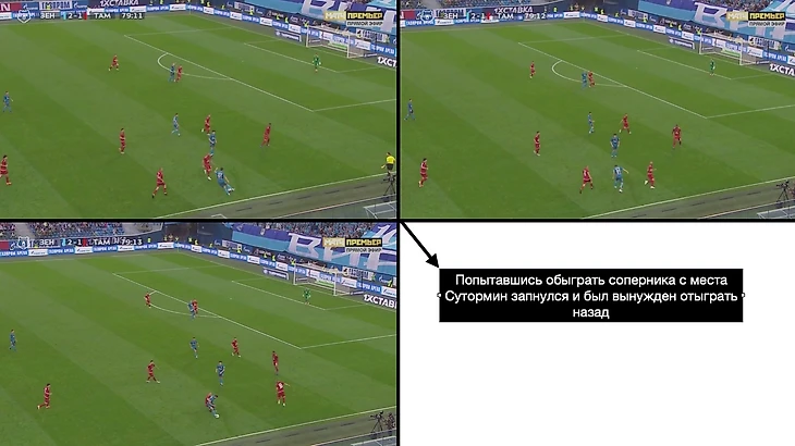 В таком случае у Сутормина появляется больше времени для принятия решения, он имеет возможность поднять голову. Но возрастает и важность подстраховки , ведь оба фланговых игрока оказываются очень высоко, оставляя фланг уязвимым к контратакам.