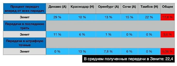 И если процент передач вперед снизился в пределах нормы: тут цифра Роберта Мака образца прошлого сезона остановилась на отметке 22,2%, Ригони — 19,1, да и в целом, учитывая игру Оренбурга, Алексей нередко двигал мяч вперед из более глубоких позиций, то передачи в последнюю треть и штрафную стали сильно ниже конкурентов.