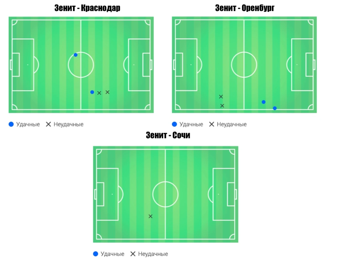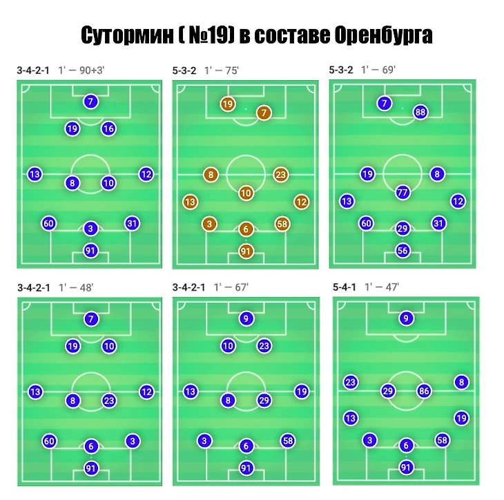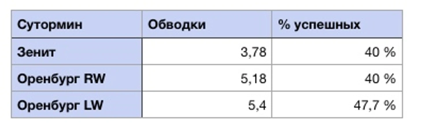 Для максимально возможной корректности сопоставления игры Алексея в дальнейшую выборку мы включаем только встречи или отрезки встреч, в которых он выступал на позиции наиболее приближенной к его текущей в Зените — инсайд, реже крайний полузащитник. При этом важно понимать, даже располагаясь на схожей позиции на бумаге, футболисты Оренбурга имели индивидуальные роли и задачи, что придавало схеме ассиметричный вид, а также накладывало определенный отпечаток на показатели игроков.