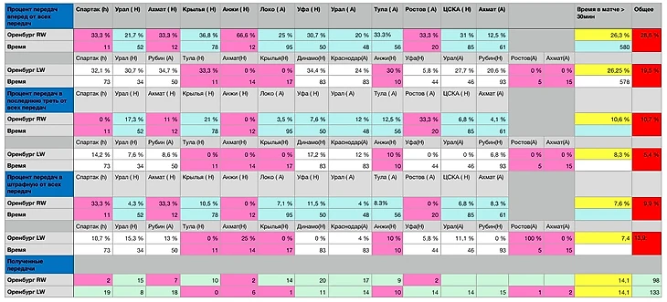 Таблица по сезону 18/19 за Оренбург. Розовым цветом выделены матчи, в которых Сутормин сыграл менее 30 минут. Желтым цветом выделен средний процент по играм с временем более 30 минут. Красным выделен средний процент по всему «грязному» времени.