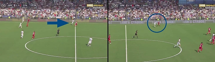 Среди примеров неспроста используется матч с Краснодаром. В связке с Сантосом Алексей чаще получал мяч в удобных для себя позициях, что сказалось и на продвижении этого мяча. На данный момент матчи против Оренбурга ( играл на бровке с Терентьевым) и Краснодара ( играл на фланге с Сантосом) статистически отличаются в лучшую сторону по сравнению с остальными, где взаимодействие было со Смольниковым.