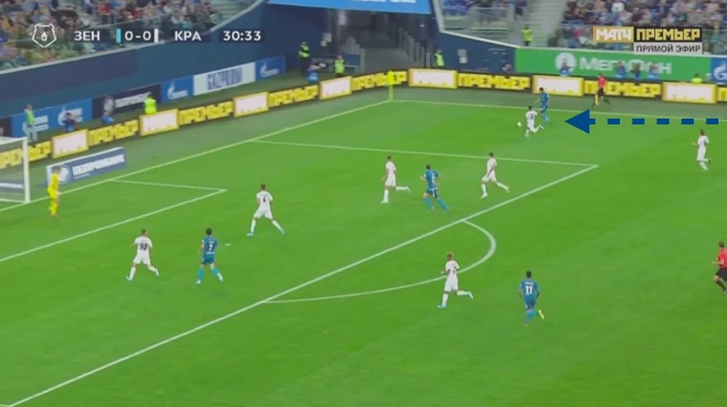 Получив пространство рядом со штрафной соперника новичок Зенита может совершить кросс ( если находится на любом из флангов),