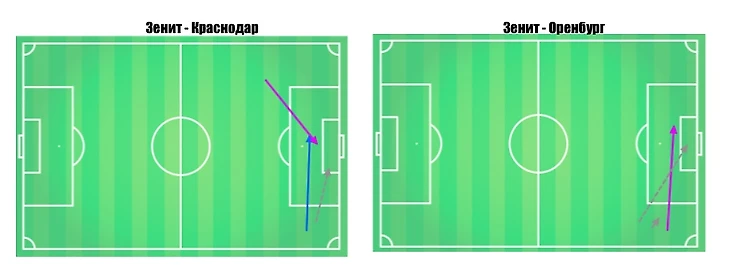 Не будем забывать и о разных стилях игры команд. Зенит проводит с мячом значительно большее количество времени ( владение 55,9% по текущему сезону против 45,5% у Оренбурга в сезоне 18/19). Это не влияет напрямую на количество контратак как таковых ( в этом компоненте по количеству оренбургский клуб уступает петербургскому: 4,8 в среднем за матч при 29,2% законченных ударом против 2,86 при 42% законченных ударом), зато коррелирует с количество позиционных атак ( 33,4 в среднем за матч при 17,8% завершенных ударом у Зенита против 27,5 при 17,3% завершенных ударом у Оренбурга), а , как следствие, косвенно влияет на зоны, в которых игроки атаки получают мяч.