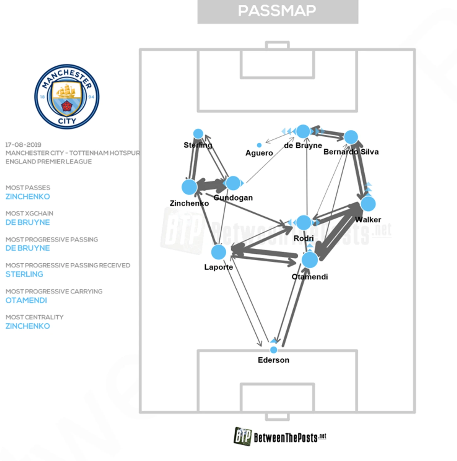 Без мяча «Тоттенхэм» закрыл центр поля, там располагалось 5 игроков, но это не помогло им перекрыть атаки соперников. Акцент атак «Сити» сместился на фланги (только 21% атак через центр), что видно по карте передача. Они располагались в 4-2-3-1.