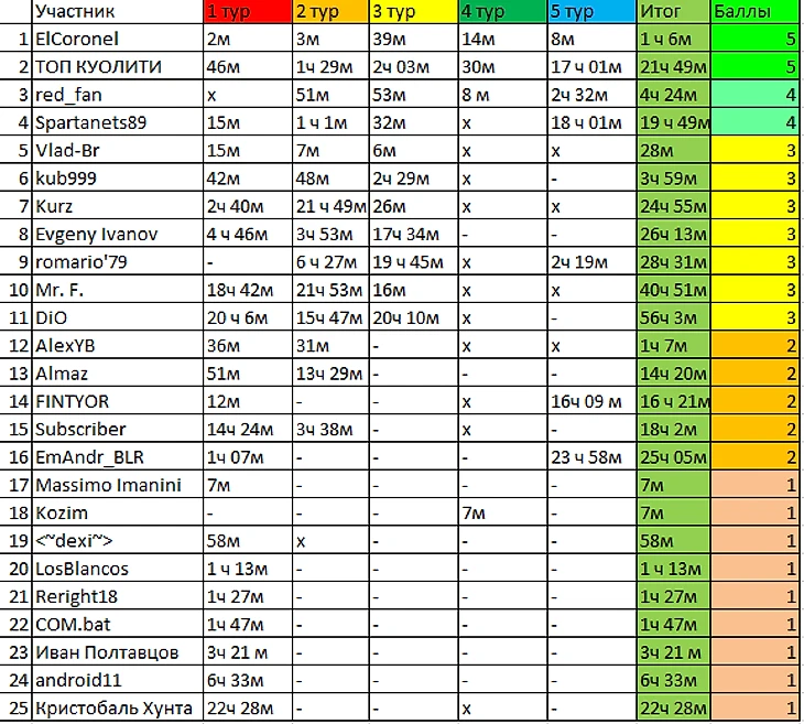 Борьба за призы как в биатлоне - разбилась на пары. За первое-второе место спорят ElCoronel с ТОП КУОЛИТИ, а за бронзу у нас лихая внутрикомандная заруба red_fan и Spartanets89.