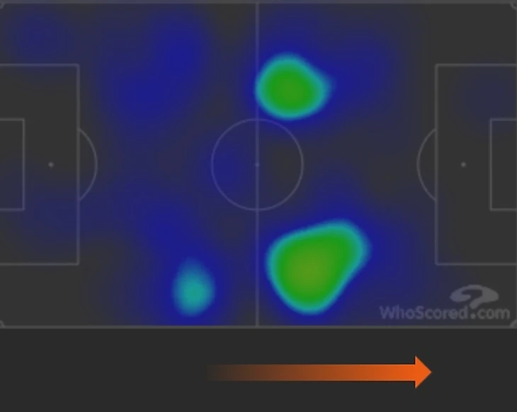 Ниже – тепловая карта Морица Ляйтнера против «Ньюкасла», которая как нельзя более красноречиво отображает важность немца при конструировании атак. Главная фишка тактики «Норвича» в прошлом сезоне – расположение основной атакующей группы в одном из полуфлангов и проведение комбинаций в перегруженной зоне. Ляйтнер для подобной системы организации наступлений – просто конфетка. Он не ломается под давлением, быстро соображает и может отдать качественный короткий пас при дефиците пространства. 105 передач – это просто космическая цифра, превосходящая показатель ближайших преследователей из обеих команд практически вдвое (особенно убийственно она смотрится при 90% точности). Немец действительно мало обострял, однако невероятно точно и разумно действовал в начальной и средней фазах развития атак.