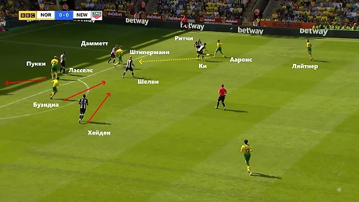 «Норвич» терроризировал левый фланг обороны «сорок» - через него команда Даниэля Фарке провела 51% своих атак. «Канарейки» создавали на нем численное преимущество за счет смещений Штиперманна, Пукки (который в принципе максимально редко оказывался на другом краю) и Буэндии/Кэнтуэлла, подключений Ляйтнера (реже – Трибулла) и Макса Ааронса. Скрин ниже - далеко не самый красноречивый (не нашел запись полного матча, а на Okko стоит защита от скринов), однако он дает примерное представление о том, как атаковал «Норвич». Ляйтнер на дриблинге протащил мяч к правому флангу, отдал на Ааронса, после чего Пукки побежал открываться в штрафную, а Штиперманн и Буэндиа выдвинулись на подмогу англичанину и увели за собой полузащитников. В итоге, Пукки и Кантуэлл оказались в штрафной в ситуации 2v3, Штиперманн прострелил, и финский форвард смог нанести удар. Мэтт Ритчи был очень слаб в плане оборонительных действий (как при атаках соперника на скорости, так и при позиционках), а Пол Дамметт и Ки Сон Ён пока откровенно слабо понимают, как страховать партнера.