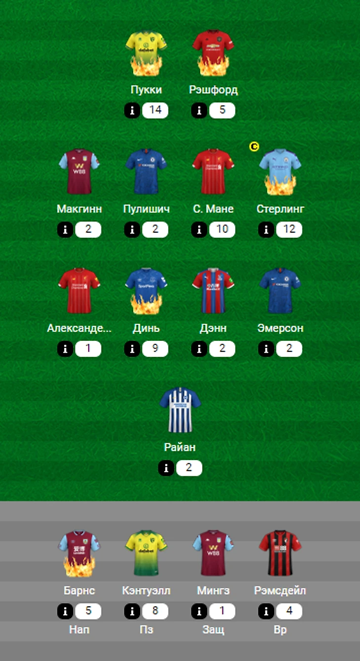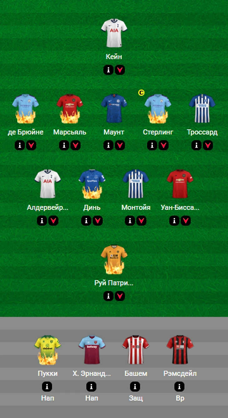 Что касается капитана, то первоочерёдными кажутся два варианта: Рахим Стерлинг, набравший 8 голов и 2 ассиста в 7 встречах с Борнмутом, и Харри Кейн, встречающийся с Ньюкаслом, которому в прошлом туре отгрузил три мяча Теему Пукки. Чуть менее популярным смотрится вариант Рэшфорд/Марсьяль или де Брюйне/Агуэро. А крайности можно варьировать от Мане до Магуайра. Хотя лучше всего выбирать, полагаясь исключительно на своё мнение/чуйку.