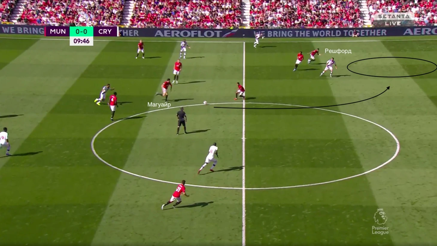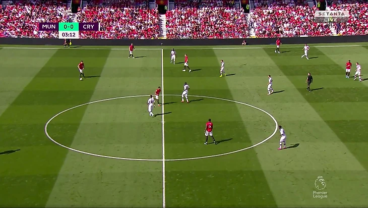 В отличие от стартового сочетания Кристал Пэлас, состав на игру у Манчестера не изменился. Кристал Пэлас играл по гибридной схеме: что-то между 4-3-3 и, когда вингеры опускались для обороны в низком блоке, 4-5-1 . Шлупп даёт большой объём работы без мяча, ведь в этом матче гости владели мячом всего 29% игрового времени.