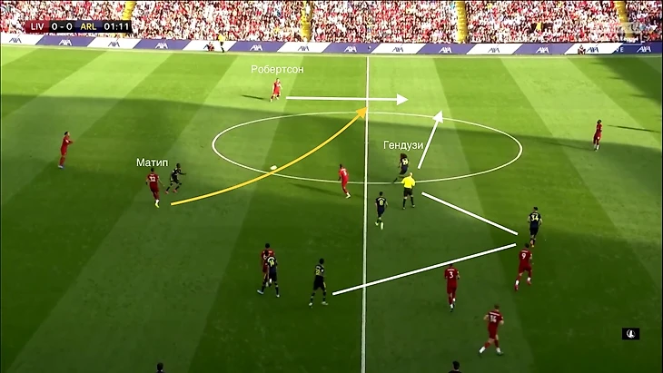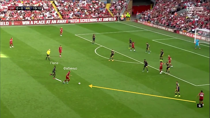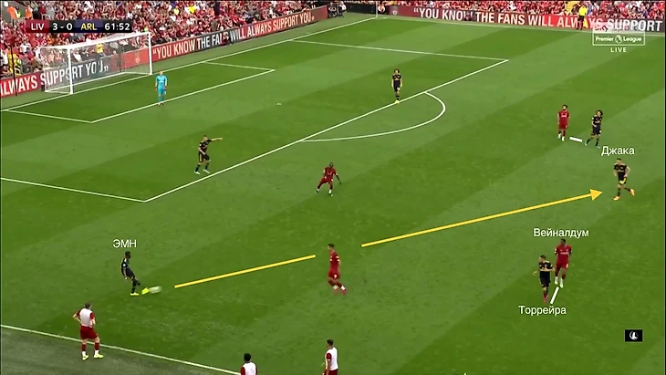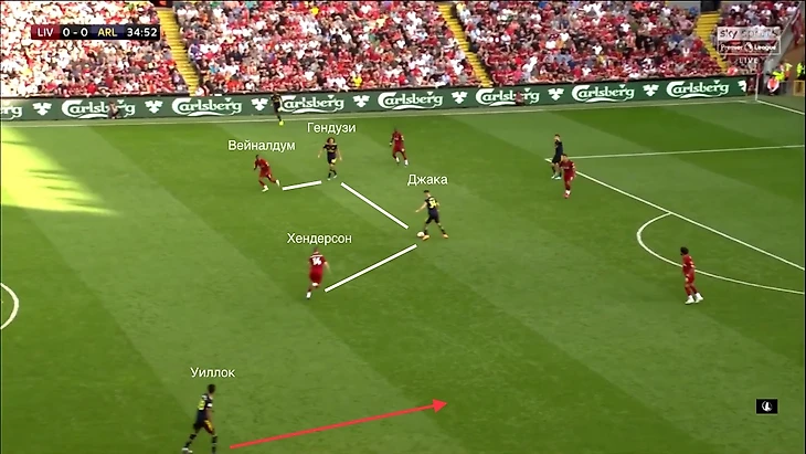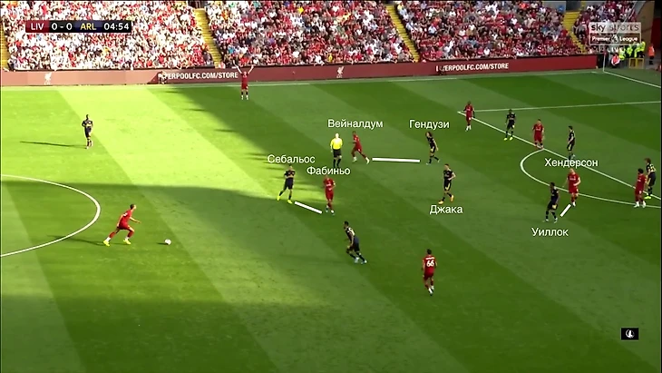 Несмотря на то, что в полузащите у "Арсенала" было три игрока, в розыгрыше мяча все равно участвовали двое - Гендузи и Джака, это их привычные роли. Уиллок и Себальос занимали позиции выше, так что Вейналдуму и Хендерсонону было удобно прессинговать француза и швейцарца. Теоретически у "Арсенала" было преимущество против одинокого Фабиньо, но Уиллок двигался пассивно, и практически это не использовал.