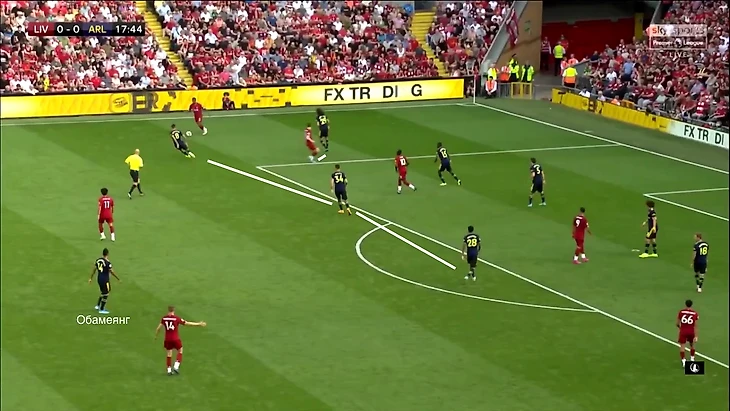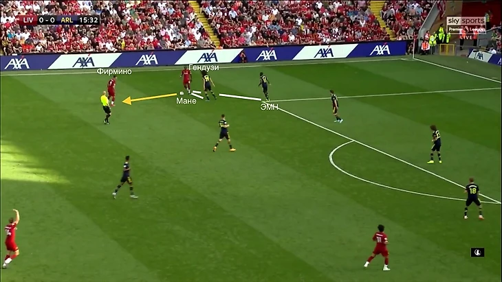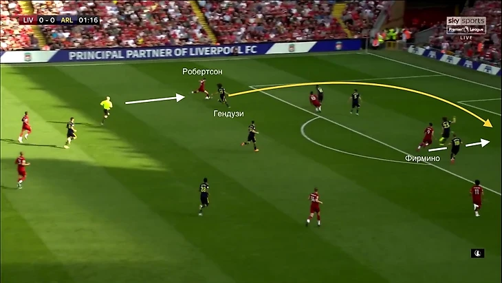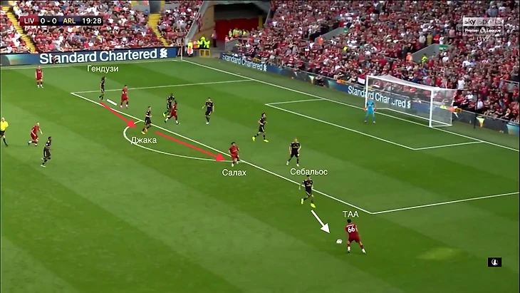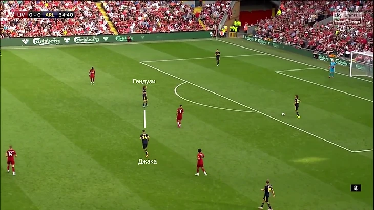 Позиционная ошибка от Джаки и Гендузи. Себальос выдвинулся на Трента, Салах остался совсем один на границе штрафной. Идти за ним должен Гранит, а Гендузи должен по цепочке перемещаться на его место. Но француз на фланге, при том, что мяч совершенно в другом месте, и опекает Фирмино. При этом четверка защитников играет против одного Мане.