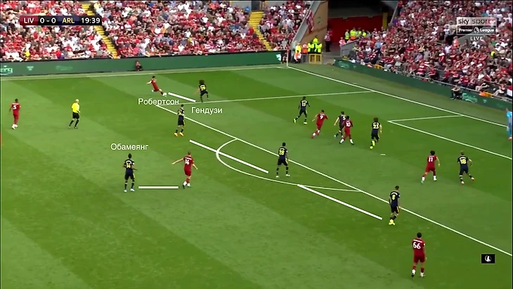 Когда испанец готовился к матчу, он, вероятно, исходил из двух целей: на скорости атаковать очень высокую линию обороны, как это делали "Челси" и "Саутгемптон", и одновременно с этим закрыть для "Ливерпуля" центр, играя 3-в-3 против полузащиты хозяев, + Джака против опускающегося Фирмино или в качестве подстраховки. Возможно, настолько освободив фланги, Эмери даже намеренно пытался вытащить крайних защитников Клоппа, чтобы оставлять Пепе и Обамеянга 2-в-2 против центральных защитников.