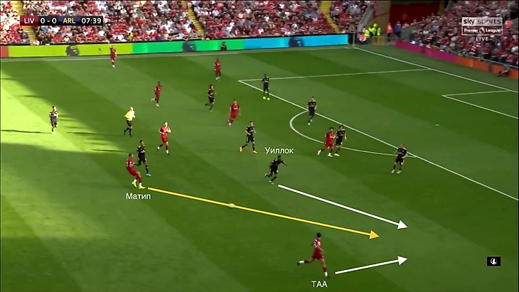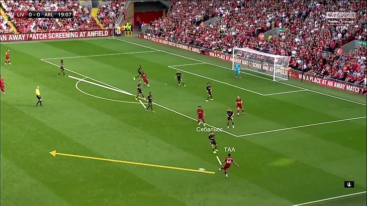 Получилось все, конечно же, по-другому. Из-за низкого блока и "Ливерпуля", который быстро сориентировался - стал намеренно играть на фланги и быстро переводить мяч, крайние полузащитники в тройке перестали успевать выдвигаться на ТАА и Робертсона, в итоге те получили мега много свободы. На самом деле, не успевали они буквально с самого начала матча - самый первый опасный момент от команды Клоппа родился как раз из свободы шотландского защитника.