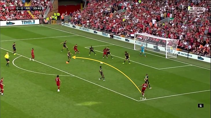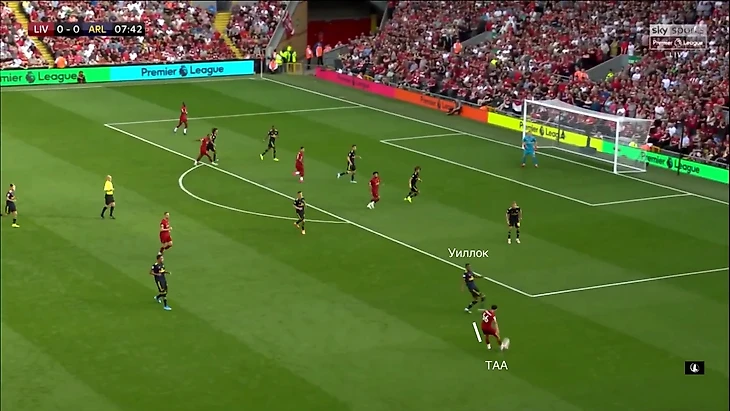 Другое дело, что из этой свободы ничего конкретного они не создавали. 8 и 13 кроссов от ТАА и Робертсона соответственно за первый тайм, но по-настоящему опасных было немного (2 и 3 точных соответственно), в основном с угловых (все 3 успешные от Трента). Все потому, что "Арсенал" очень плотно играл против кроссов и снимал весь верх.