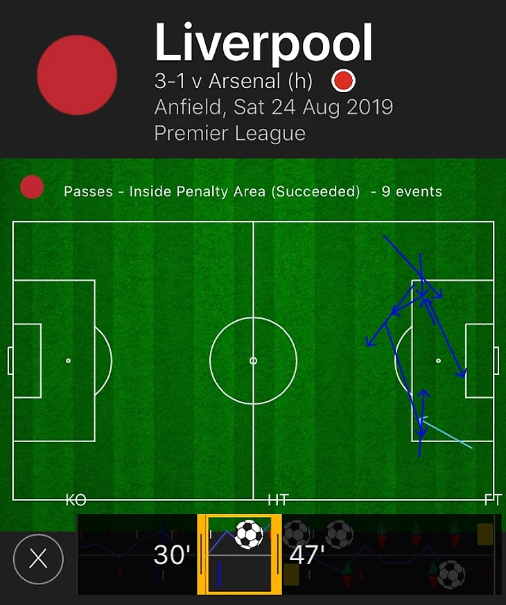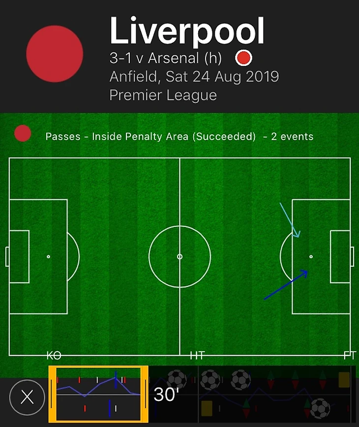 В итоге, под конец тайма "Ливерпуль" реально полностью отжал у "Арсенала" зону 14. И, если бы "красные" продолжали просто навешивать, у "канониров" все было бы относительно нормально, но хозяева грамотно подстроились. Вместо бесполезных навесов, "Ливерпуль" стал использовать опорную зону, как стартовую площадку для резких врывов в штрафную. Против пассивно стоящих там защитников это было очень эффективно.