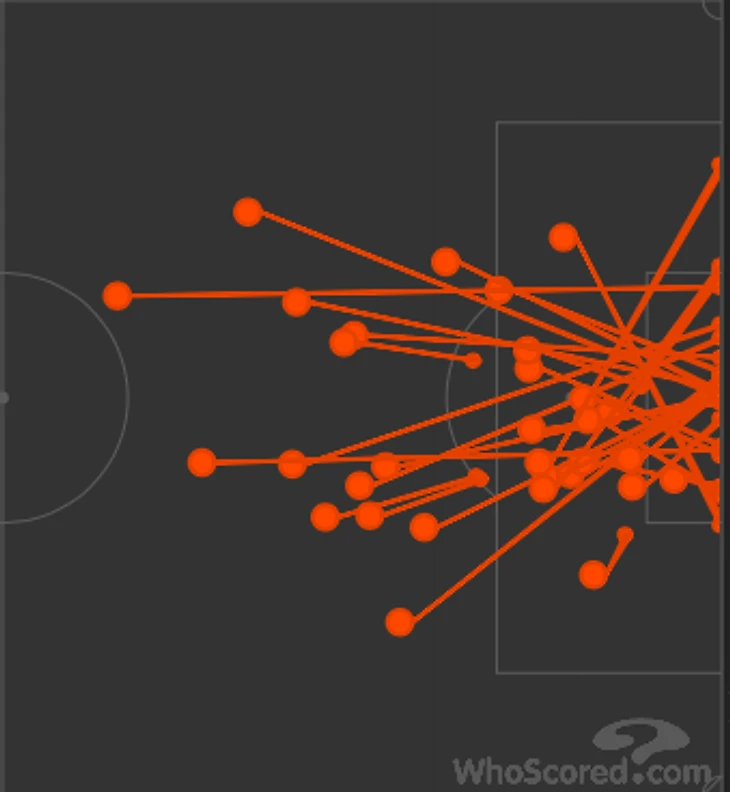 На карте еще больше впечатляет. Были даже несколько попыток забить с центра поля. Самая дальняя – Шомуродова, а еще две – Еременко.