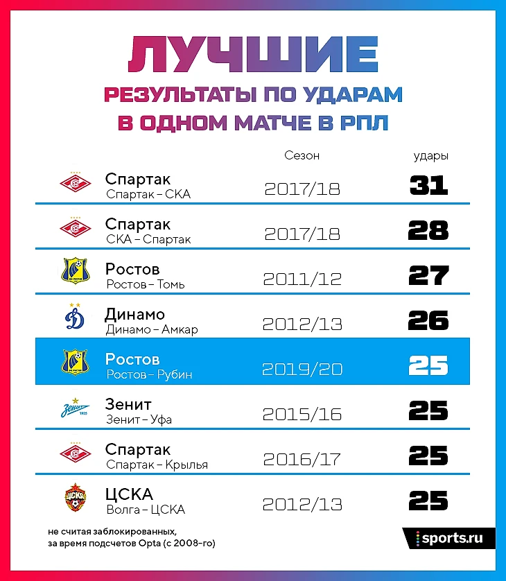 И самое главное: так много в одни ворота не били с сезона-2017/18, а вообще это пятый показатель в эру продвинутой статистики (Opta считает удары в РПЛ с 2008-го и не учитывает заблокированные, поэтому «Ростову» засчитали только 25 ударов).