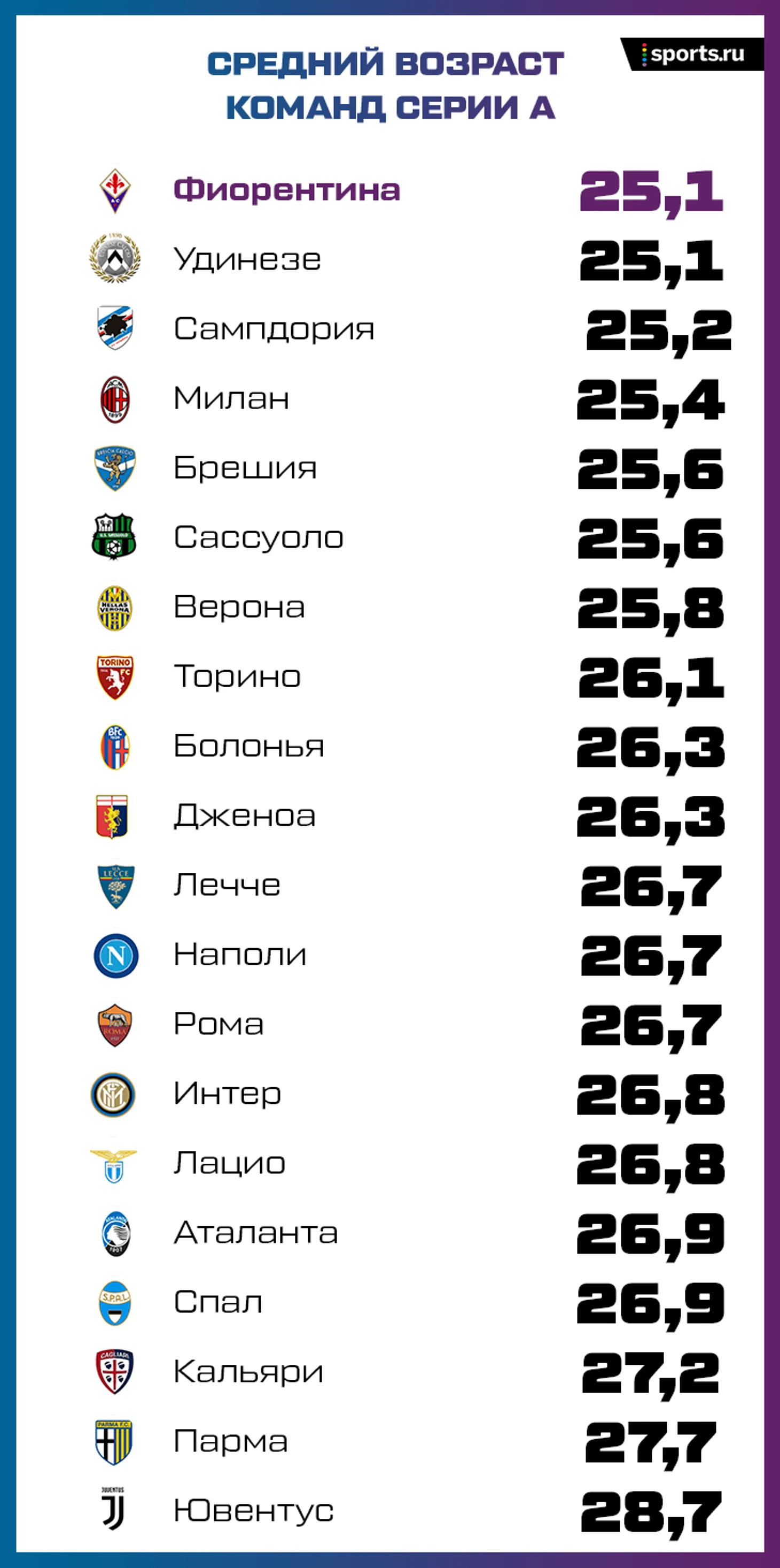 Присутствие Рибери не влияет на ситуацию. Средний возраст всех игроков «Фиорентины» – 25,1 лет. Самый возрастной в Италии – «Ювентус», 28,7 лет.